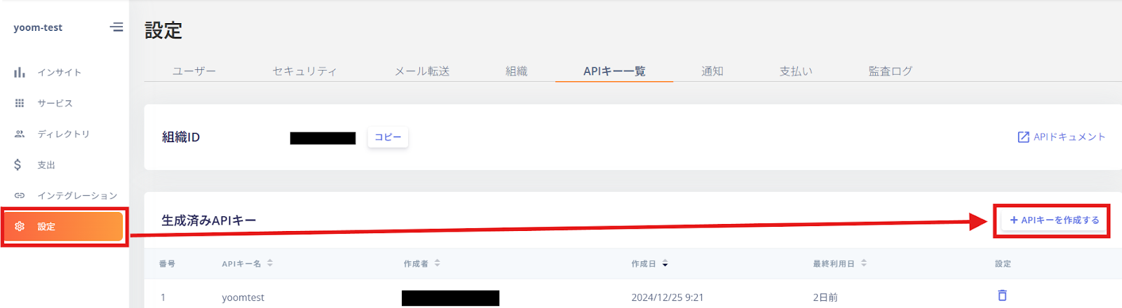 マネーフォワード Adminaの画面に移動し、「設定」→「APIキーを作成する」の順でクリックし、APIキーを取得してください。