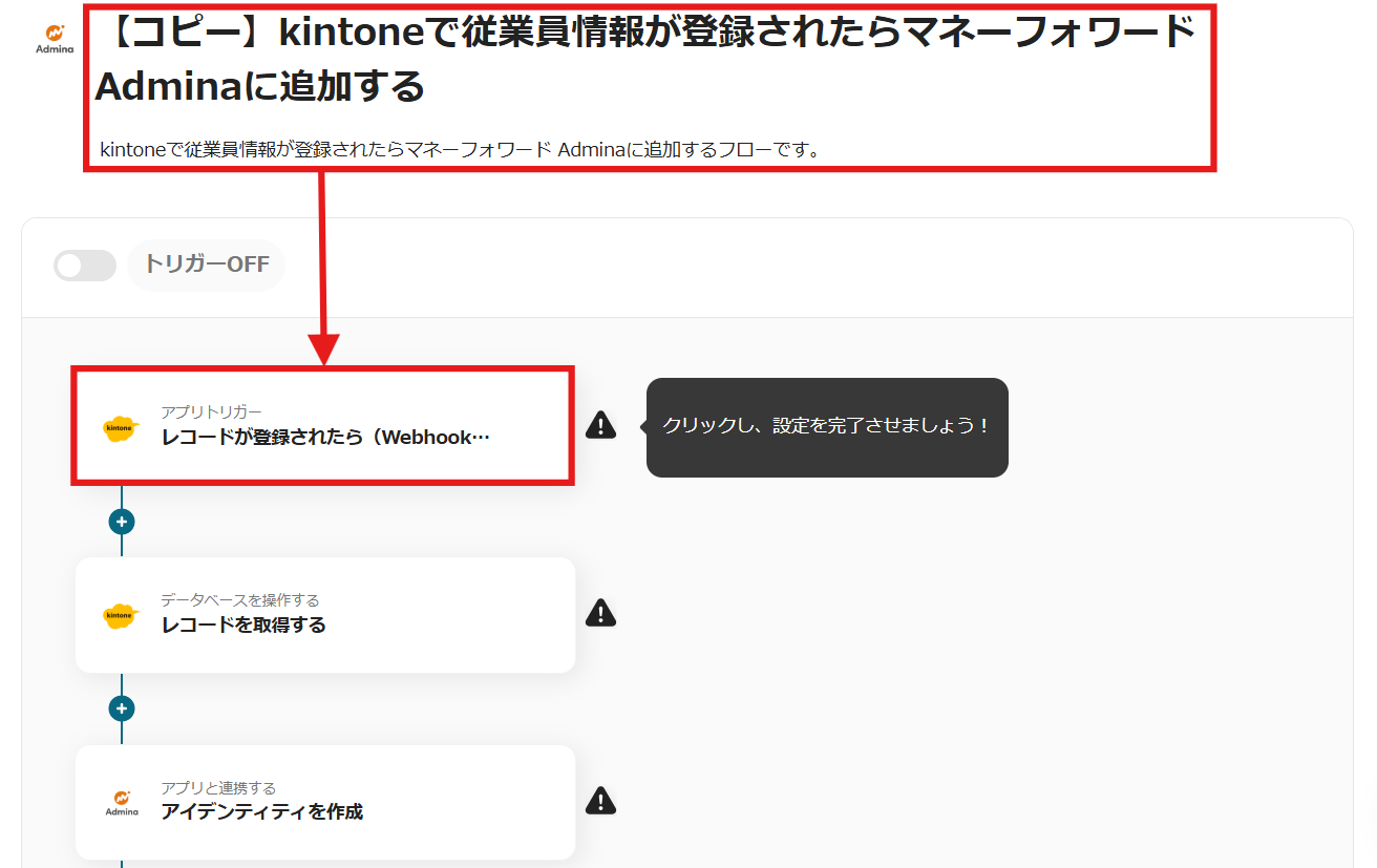 1.Notionで従業員情報が登録されたら、自動でマネーフォワード Adminaに追加するフローです。