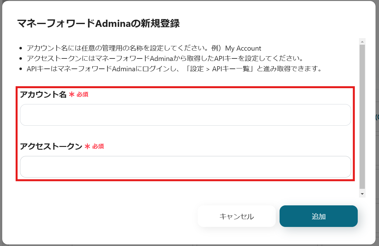 kintoneとマネーフォワード AdminaをYoomに接続するマイアプリ登録を行ってください。
