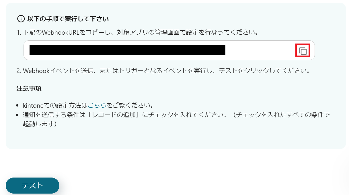以下の画面が表示されたら、赤枠内をクリックしてWebhook URLをコピーしましょう。