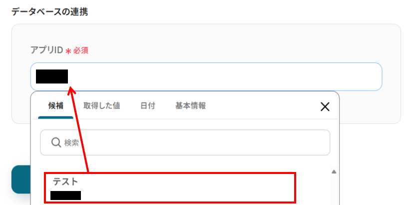 次に、データベースの連携のアプリID入力欄をクリックし、先ほど作成したkintoneアプリを選択しましょう。