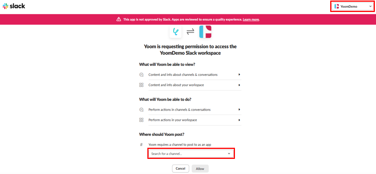 次に画面下部のプルダウンより、投稿するチャンネルを選択し「Allow」をクリックします。