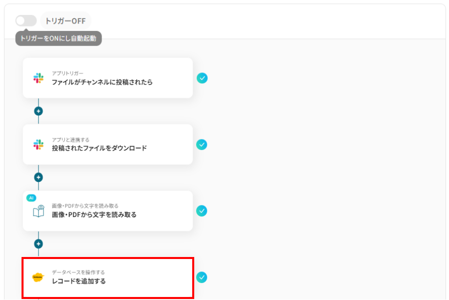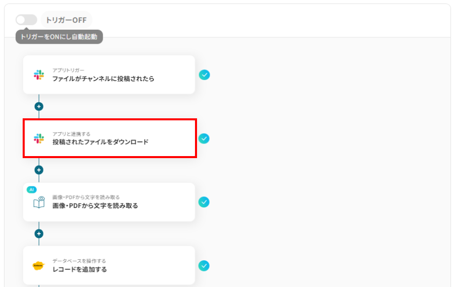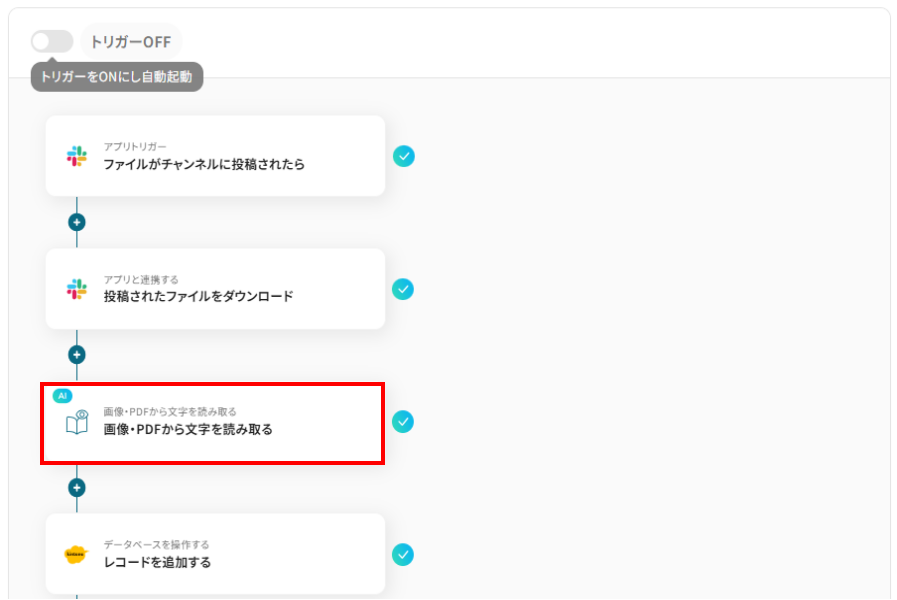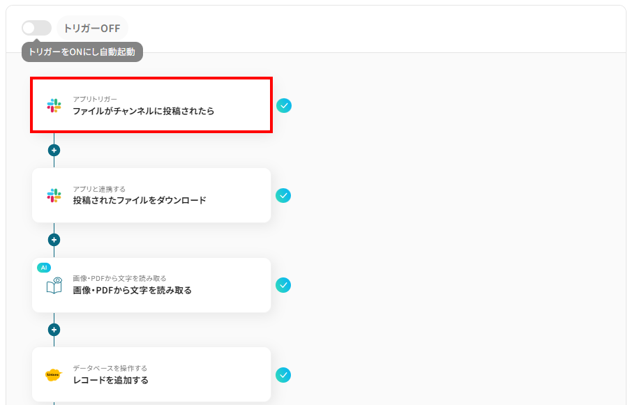 ここでは代表的な例として、Slackから送信されたファイルをOCRで読み取り、kintoneに追加するフローの設定手順を解説します。プログラミングの知識は不要で、画面の指示に従って進めるだけで自動化を実現できます。