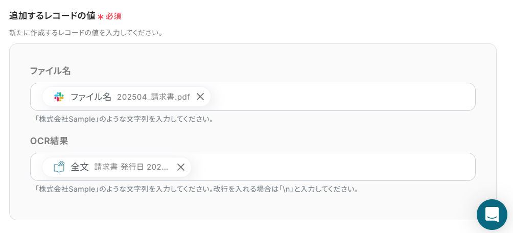 SlackやMicrosoft Teamsなどのチャットツールで日常的にファイルを受け取るなら、この自動化が便利です!チャットに投稿された請求書や申込書などのファイルを自動でOCR処理し、抽出したデータをkintoneの指定アプリに登録します。