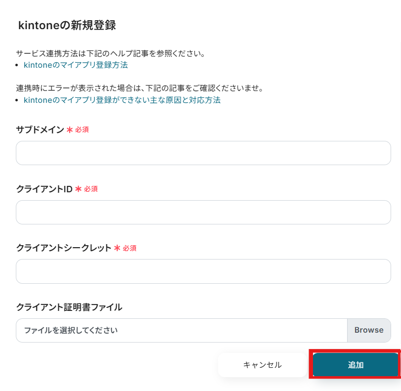 kintoneを選択できたら、事前準備で取得した情報を入力し、「追加」をクリックします。