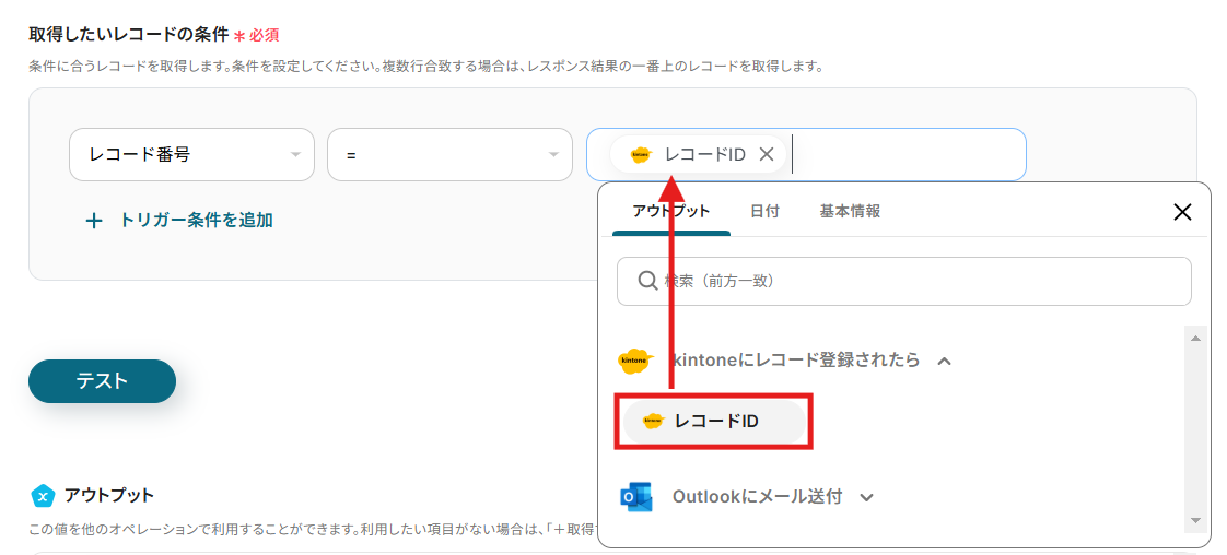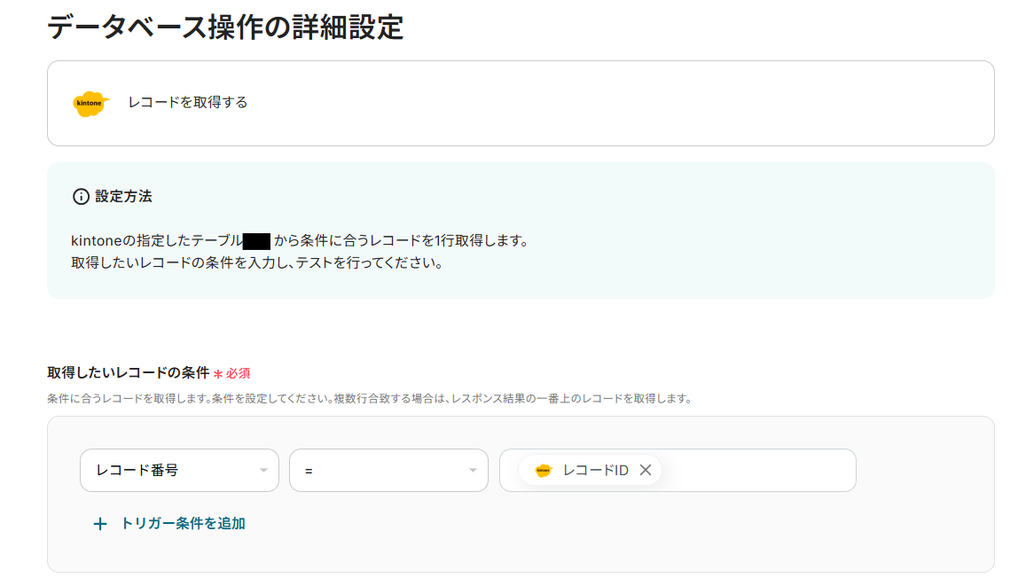 取得したいレコードの条件には「レコード番号」「=」「レコードID」となるように入力します。