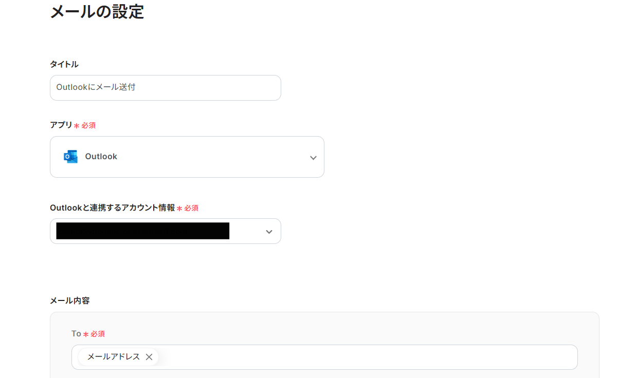 2) アクションは「Outlookにメール送付」を選択して、必須項目を入力します。