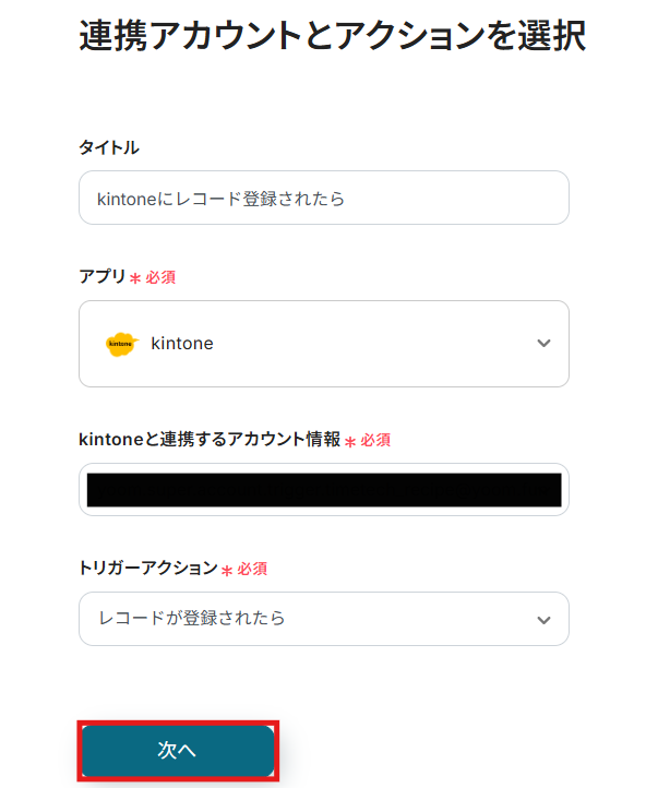 2)アクションは「kintoneにレコードが登録されたら」を選択して、「次へ」をクリックします。