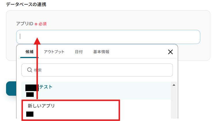 データベースの連携はマイアプリ登録がされていると候補から選択できます。