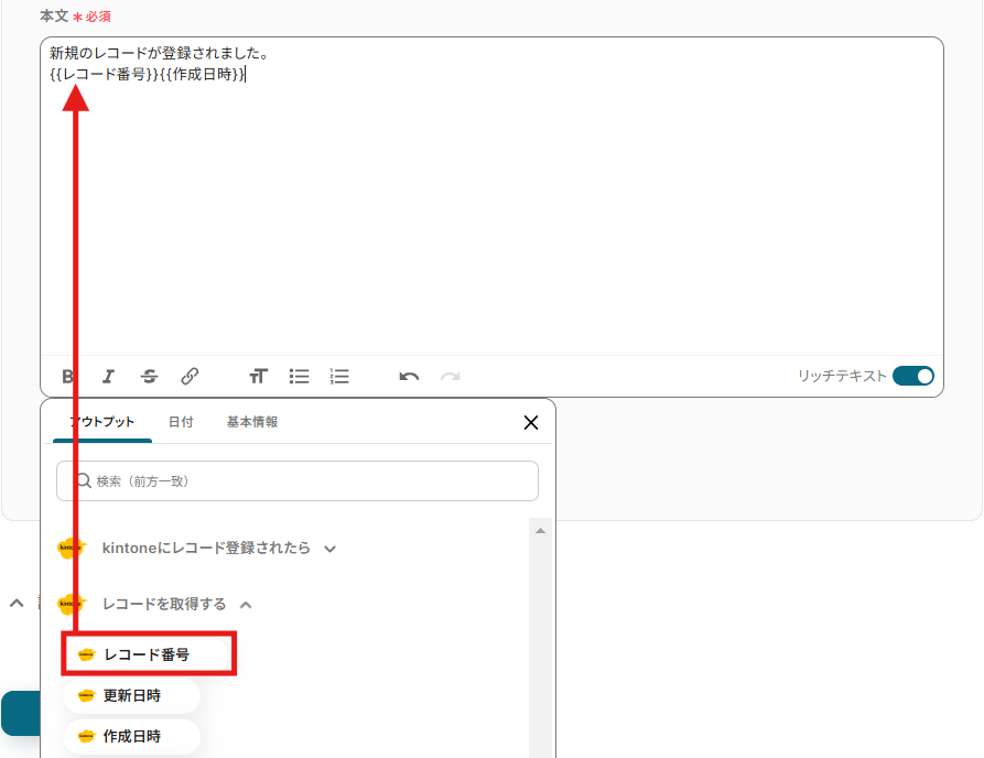 「レコードID」はkintoneのアウトプット情報を活用して入力します。
