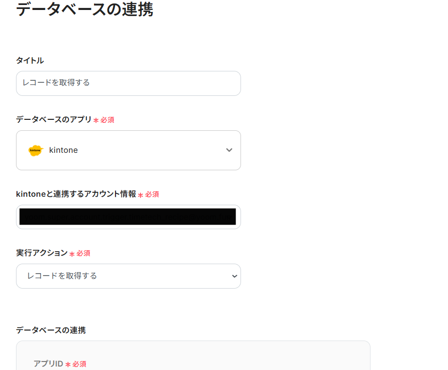 2) アクションは「レコードを取得する」を選択して、必須項目を入力します。