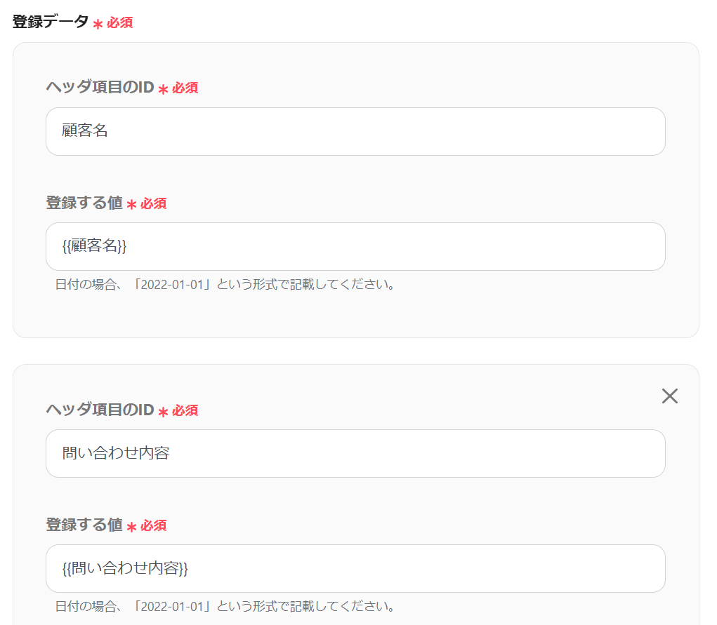 ヘッダ項目のIDは、kintoneのヘッダと揃えるとわかりやすいです。