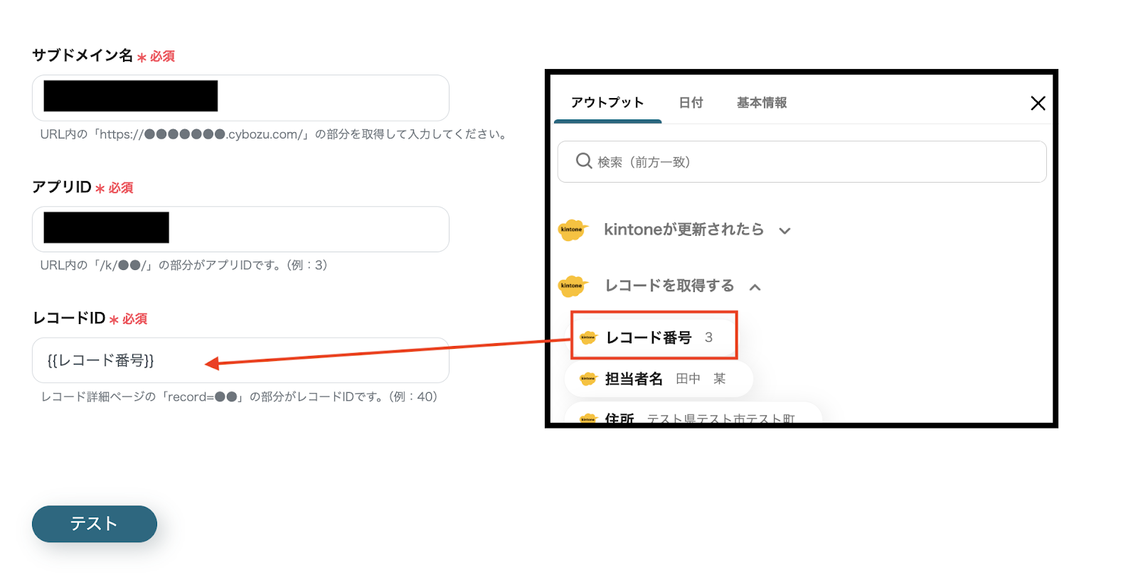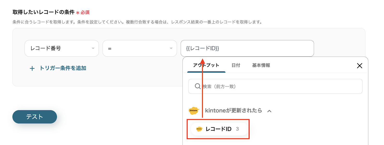 入力バーをクリックするとアウトプットを引用できるので、このステップでは「レコードID」に2つ目のステップで取得した【レコード番号】を設定します。