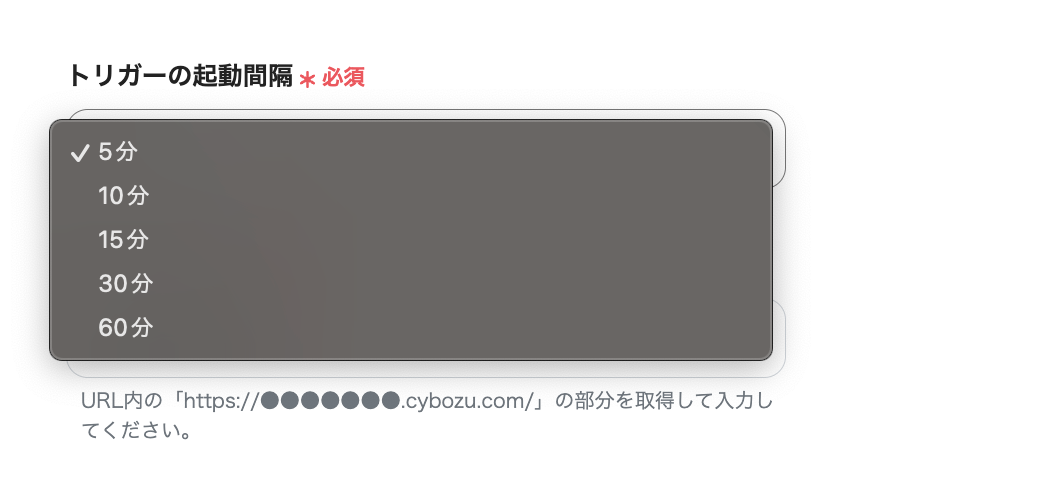 「トリガーの起動間隔」は5分、10分、15分、30分、60分から任意のものを選択してください。