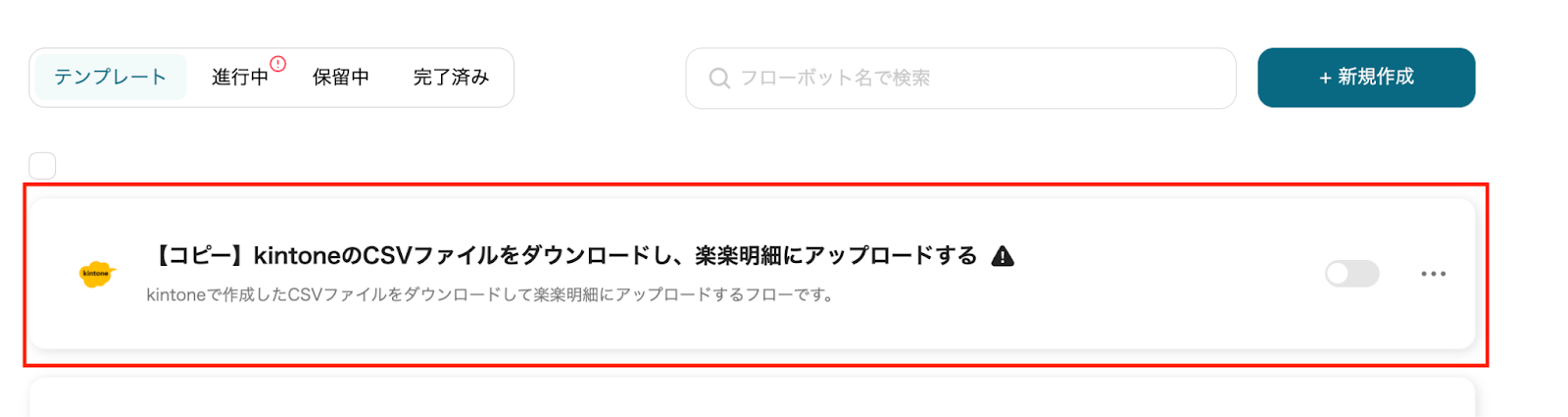 では、「kintoneのCSVファイルをダウンロードし、楽楽明細にアップロードする」のテンプレートを使ったフローボットを作成していきましょう。