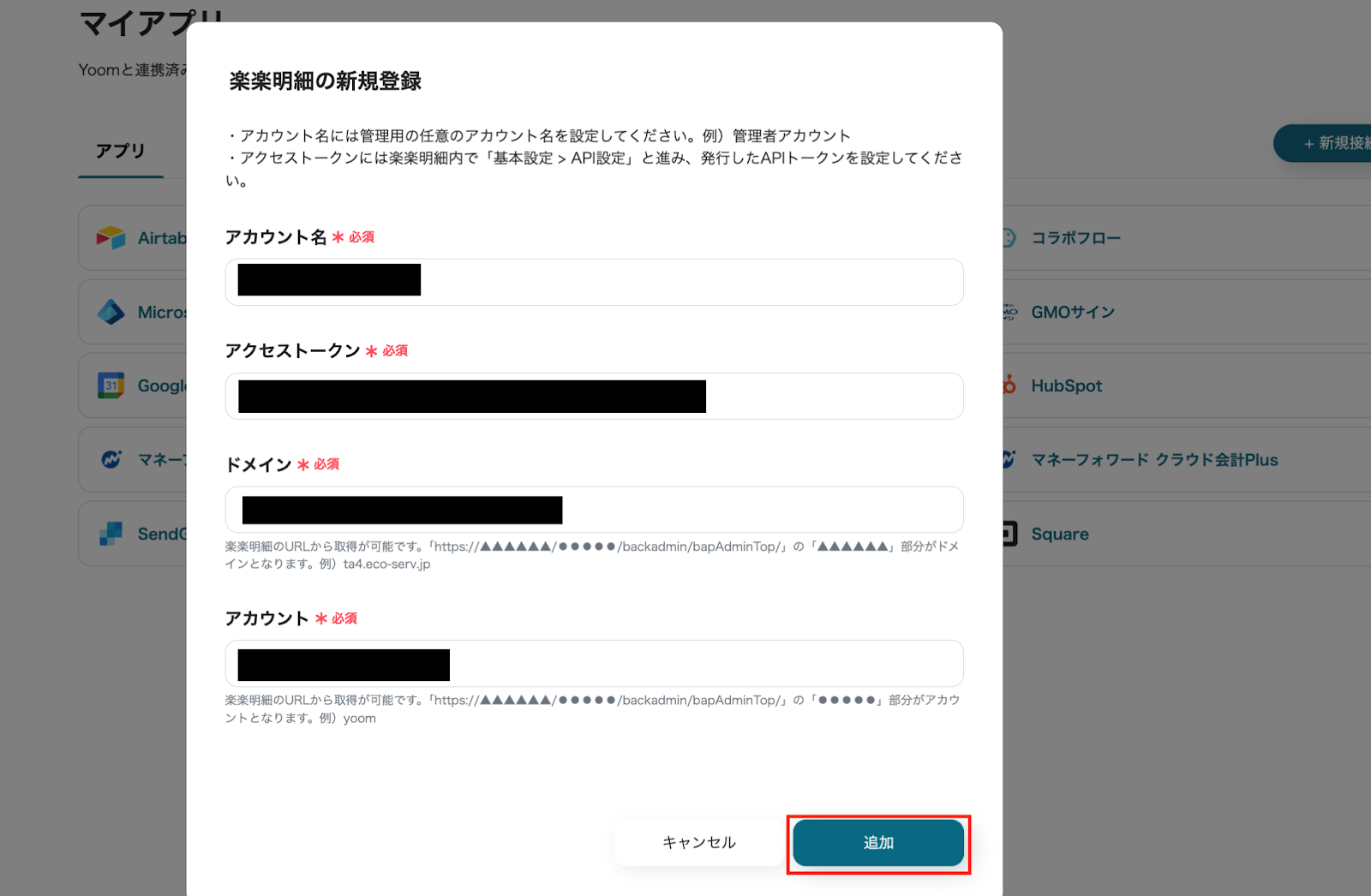 (5)「アカウント名」と「アクセストークン」、「ドメイン」、「アカウント」を入力して、[追加]をクリックします。