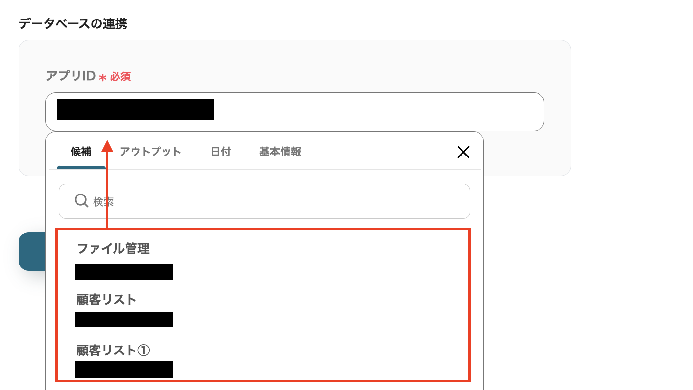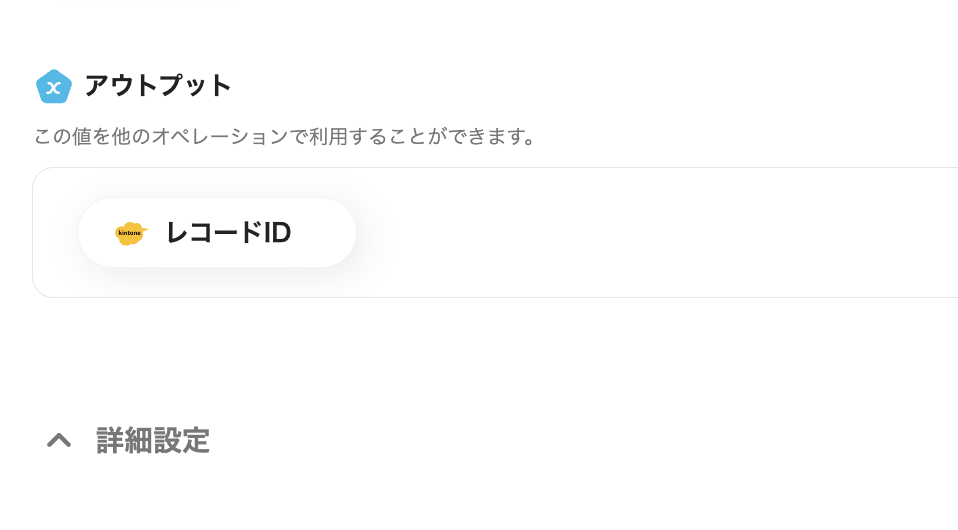 以下のように、前ステップから取得したアウトプットを引用できますので、今回は【レコードID】を設定します。