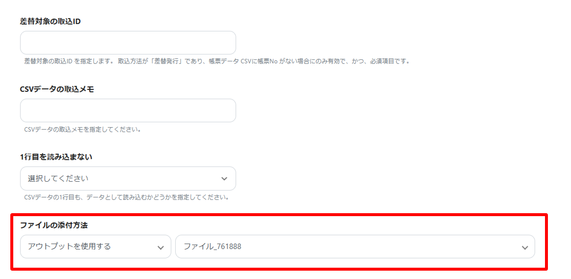 必須項目と、それぞれ必要な項目を入力していくと最後に「ファイルの添付方法」があります。