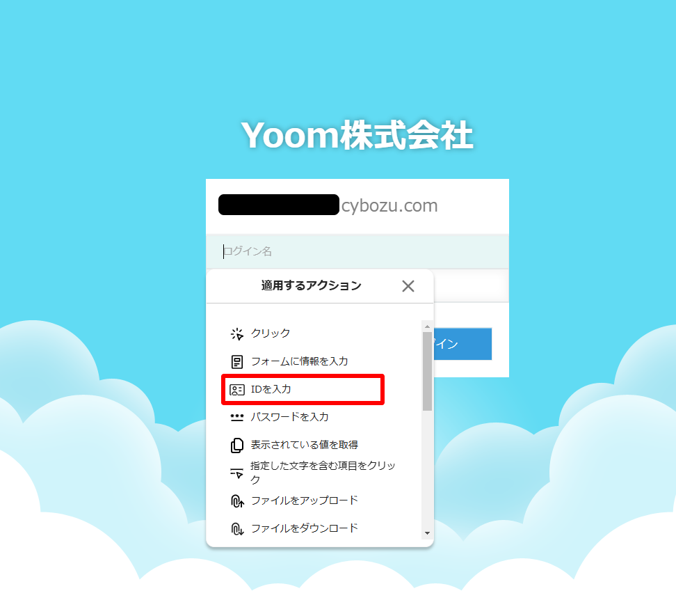 別ウィンドウでサイボウズのログイン画面が出てきたら、ひとつずつアクションを指定し、操作を進めていきます。
