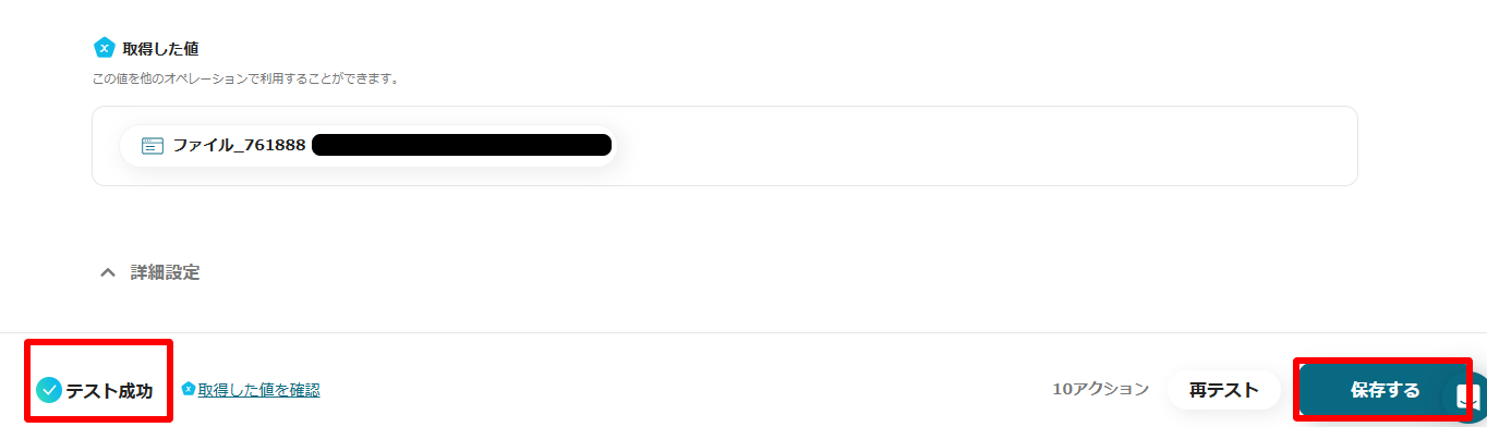 ここまで設定できたら「テスト」を実行してアウトプットに値が反映されていれば「保存する」をクリックしましょう。