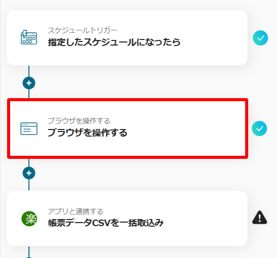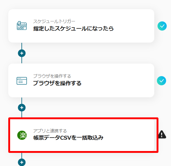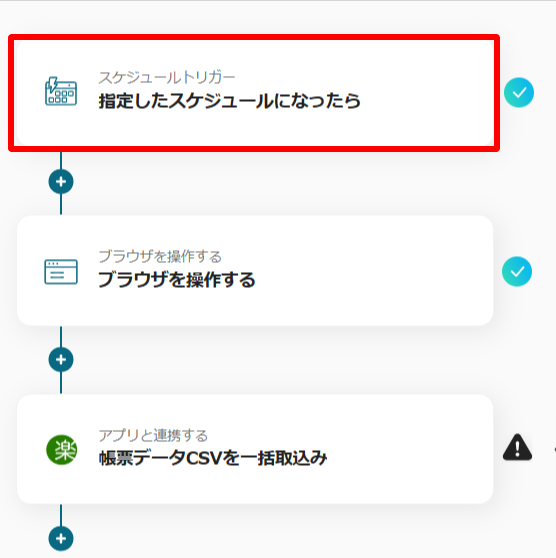 今回のフローは「特定の日時にkintone内の帳票データをCSVでDLし楽楽明細に一括インポートする」というものです。