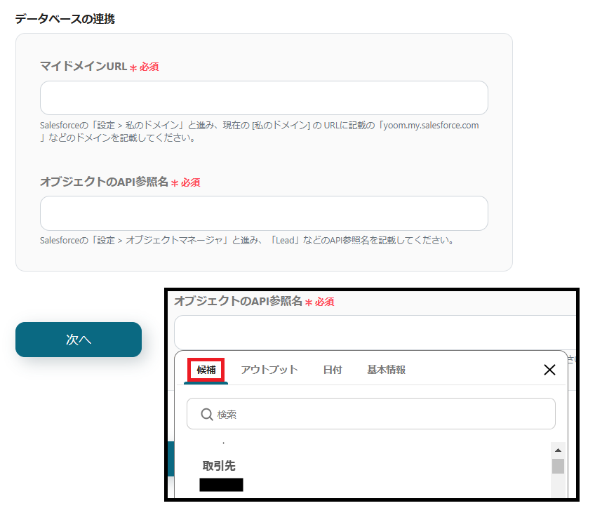 ※オブジェクトのAPI参照名は、枠をクリックして表示される「候補」から設定できます。