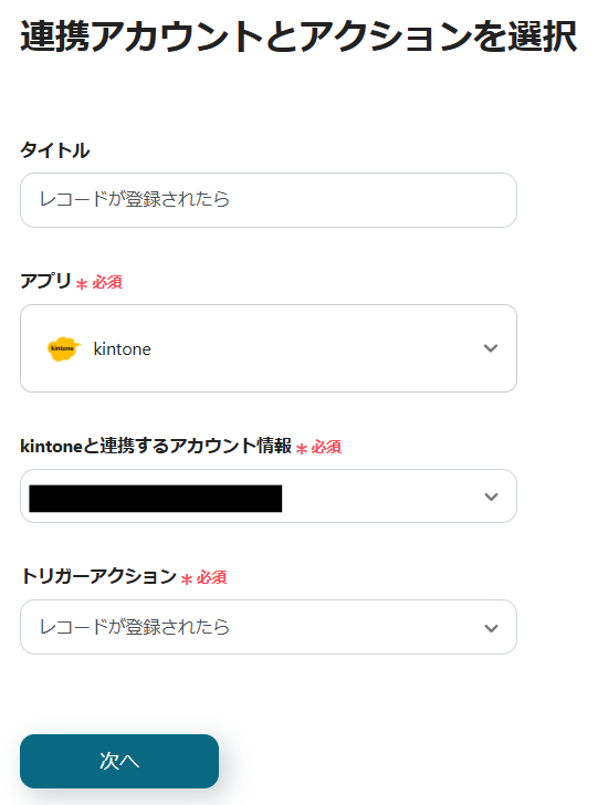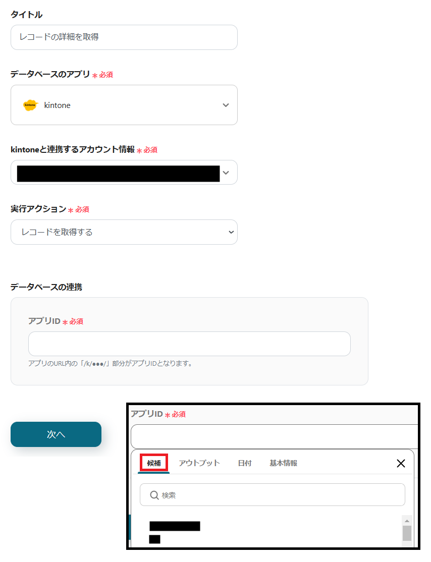 7.kintoneと連携するアカウントを確認し、アプリIDを設定して「次へ」をクリックします。
