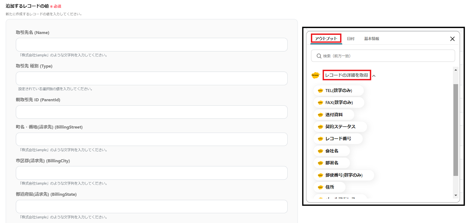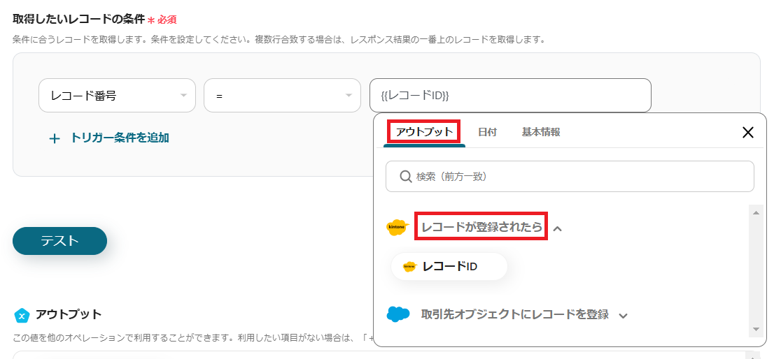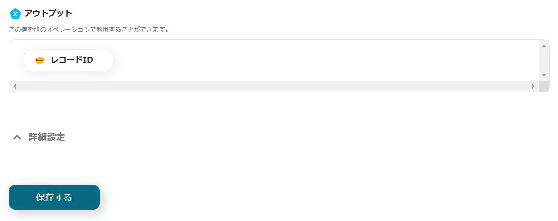 ※右枠には、枠をクリックして表示されるアウトプットの「レコ-ドが登録されたら」から「レコードID」を選択します。(値は二重括弧で表示されます)