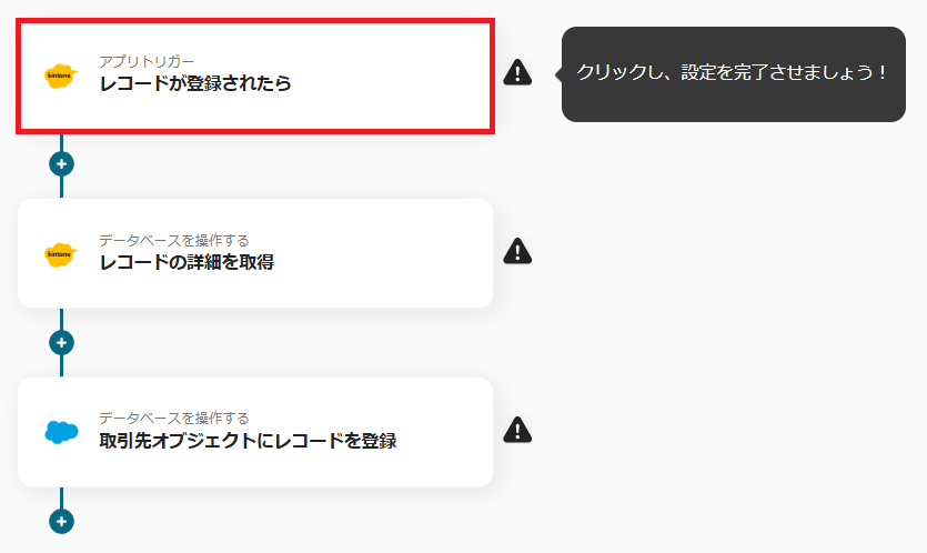 - フローの起点となるkintoneの設定、その後に続くSalesforceの設定