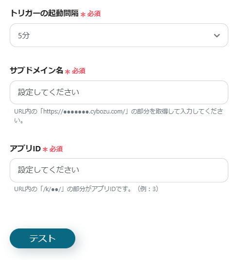 4.トリガーの起動間隔、サブドメイン名、アプリIDを設定してテストを行います。