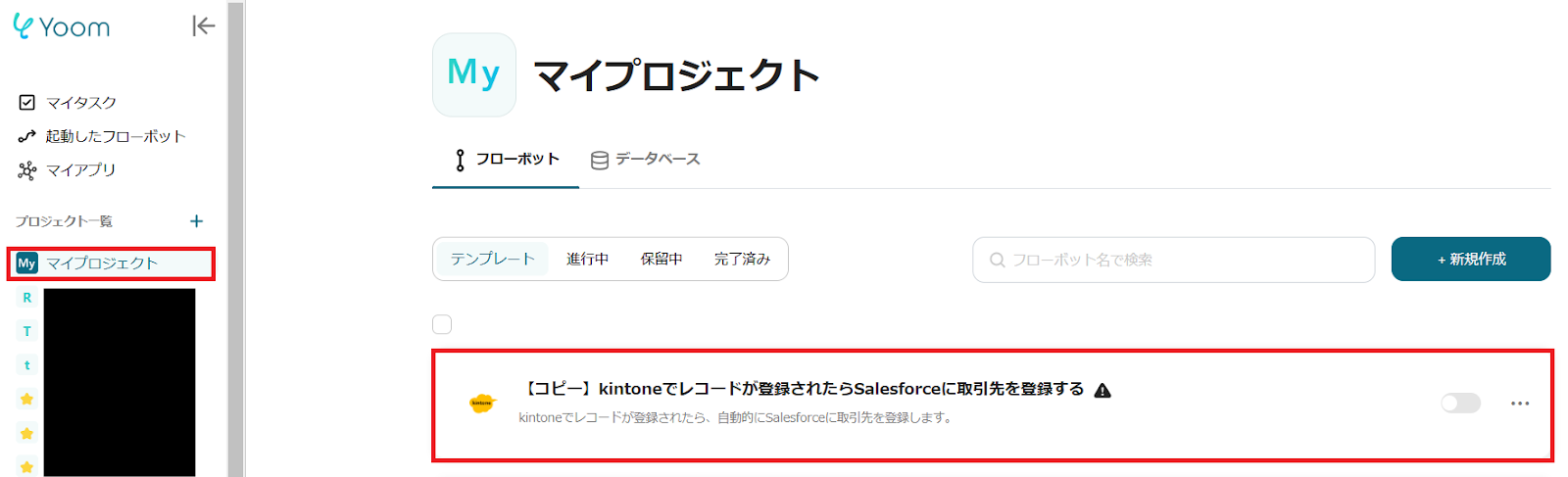 1.Yoom管理画面の「マイプロジェクト」を選択し、「【コピー】kintoneでレコードが登録されたらSalesforceに取引先を登録する」をクリックします。