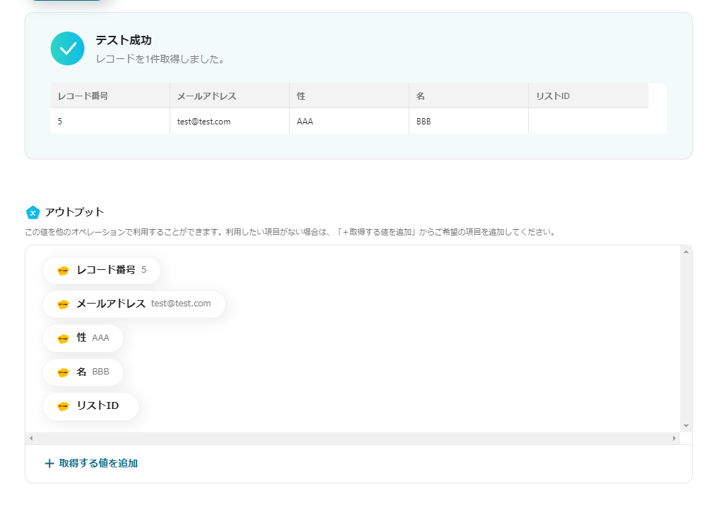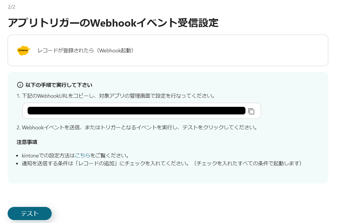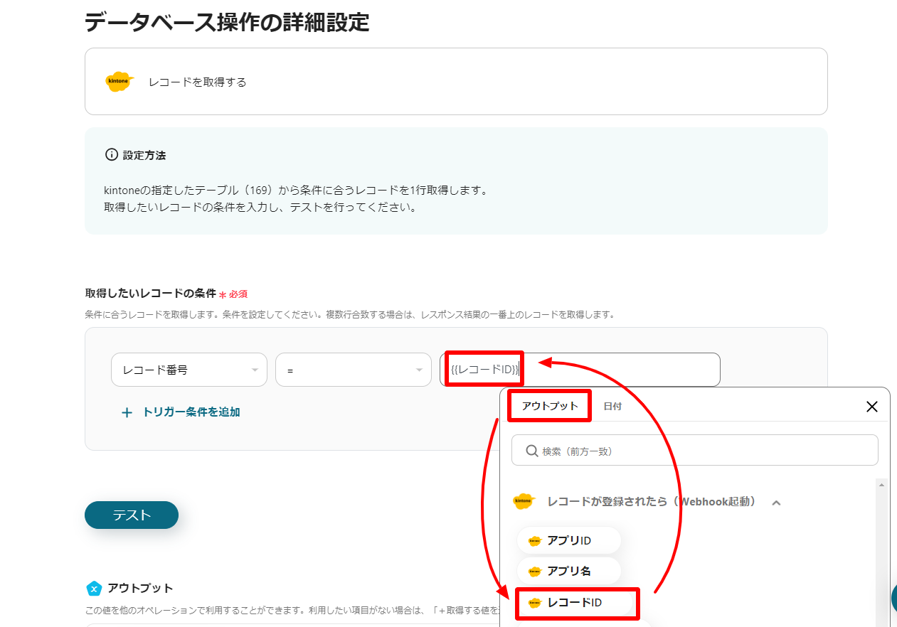 設定ができたら、仮のレコード情報をkintoneに入力してから「テスト」をクリックし、アウトプットを取得しましょう。