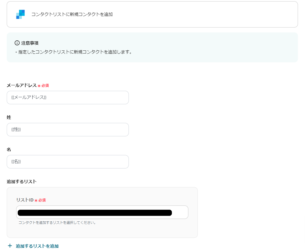 追加する情報とリストIDは候補から選択するだけで設定できます。