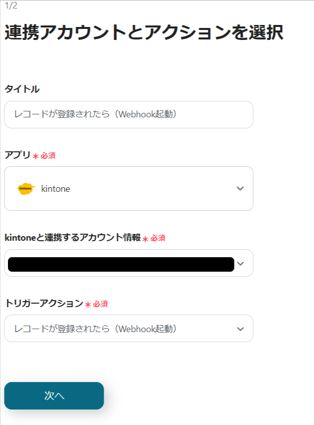 1ページ目では、kintoneの設定時と同様にアカウント情報の確認と、必要であればタイトルの修正をして次に進みます。