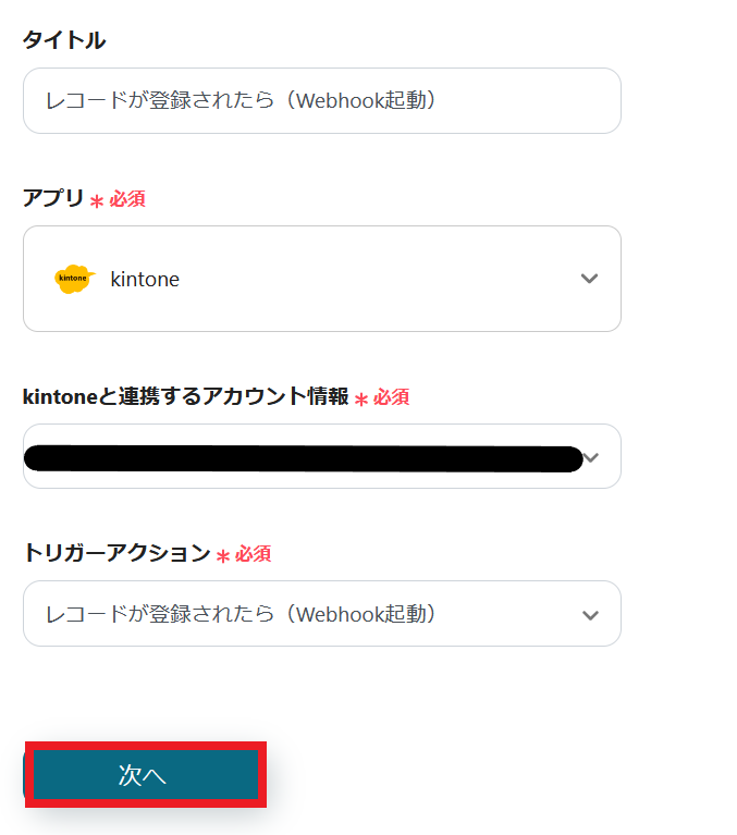 トリガーアクションは、「レコードが登録されたら(Webhook)」を選択してください。