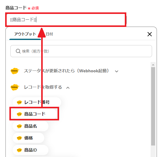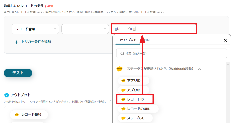 取得したいレコードの条件を、ステップ2で取得したアウトプットを用いて設定してください。
