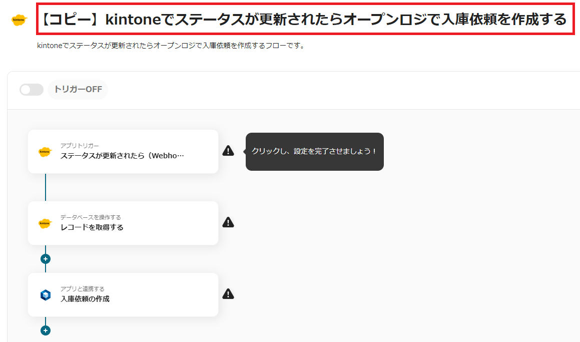 今回は「kintoneでステータスが更新されたらオープンロジで入庫依頼を作成する」フローを作成していきます!