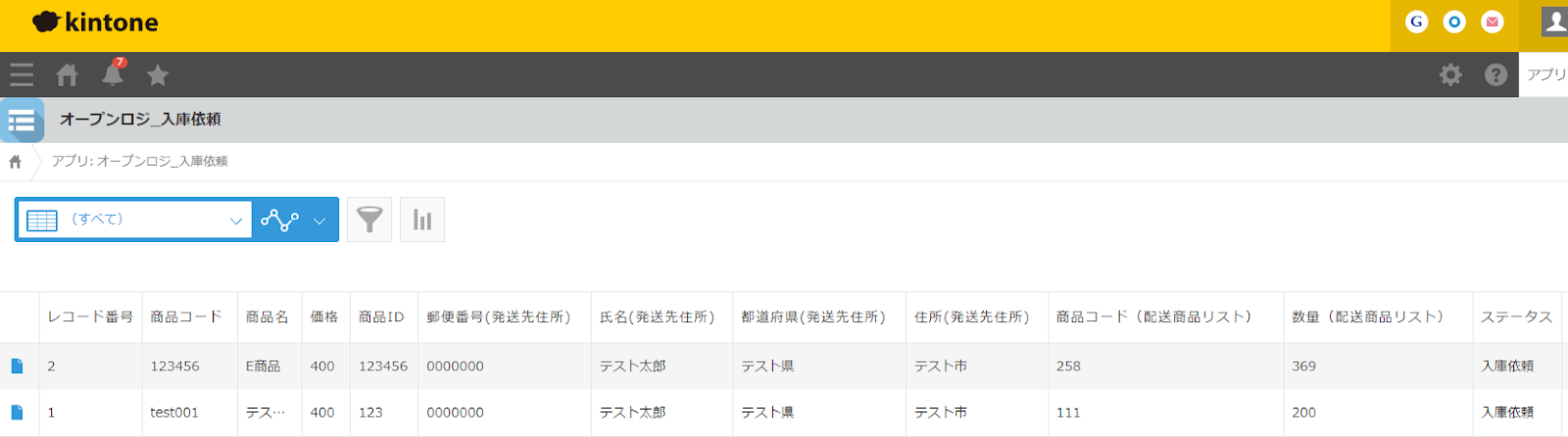 フローボットの設定後、トリガーをONにしてからkintoneに登録した入庫依頼情報が連携の対象です。