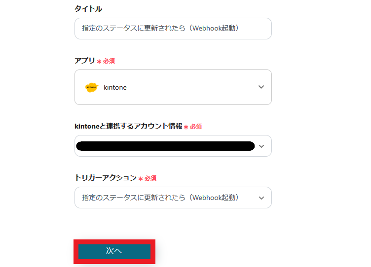 トリガーは、「指定のステータスに更新されたら(Webhook起動)」を選択します。