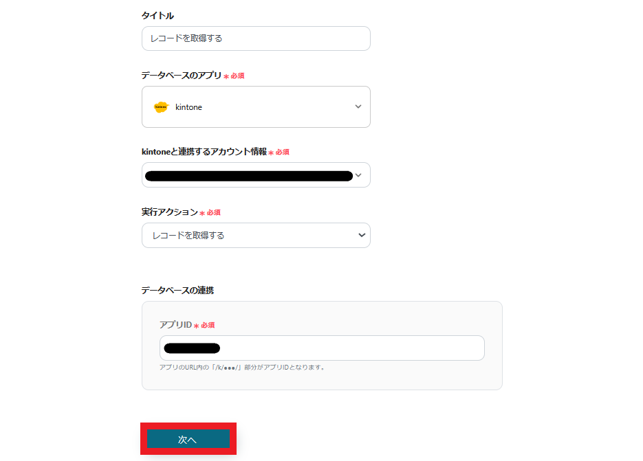 kintoneと連携するアカウント情報を入力します。