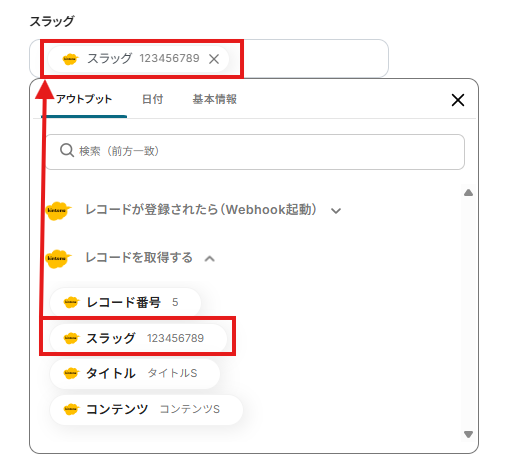 「スラッグ」「タイトル」「コンテンツ」は、入力欄をクリックして表示されるアウトプットから選択してください。