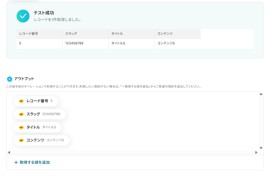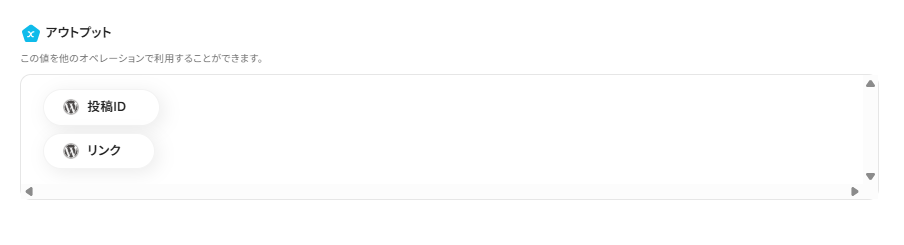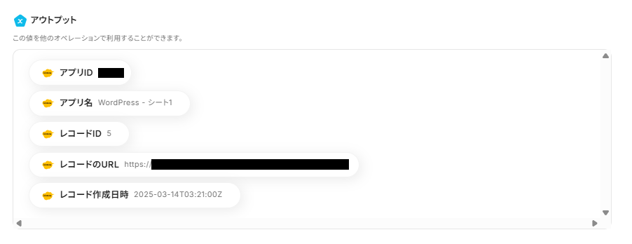 ※表示されているアウトプットは「この値を他のオペレーションで利用することができます。」と表記があるように、次の設定でも活用できます。