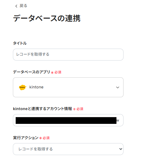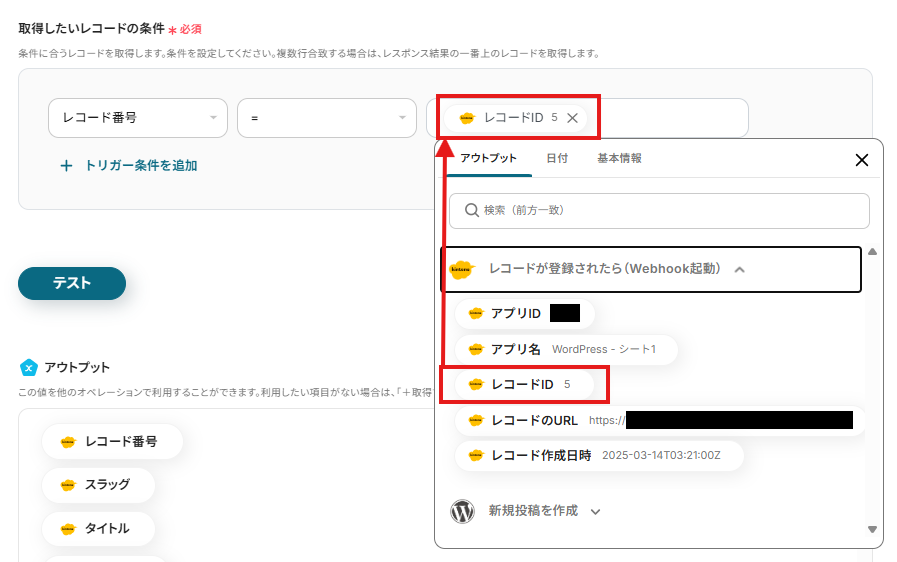 「取得したいレコードの条件」は、入力欄をクリックして表示されるアウトプットから選択してください。