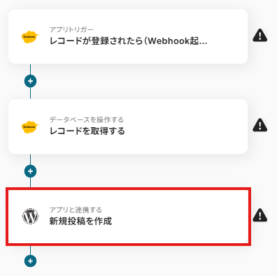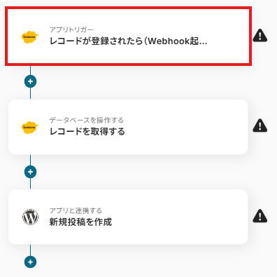 Wordpressで投稿が公開されたらkintoneのデータベースに追加するフローです。