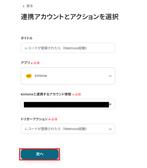 2.表示された画面で必須項目を入力します。トリガーアクションはそのままにして、「次へ」をクリックしましょう。