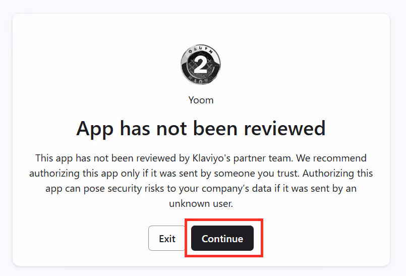 任意のKlaviyoアカウントでログインし、以下の画面で「Continue」をクリックしてください。