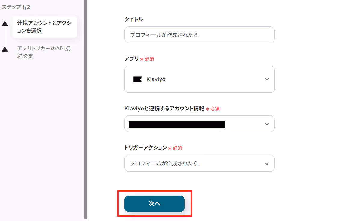 タイトルを任意で設定し、Klaviyoと連携するアカウントやアクション内容を確認したら「次へ」を押してください。