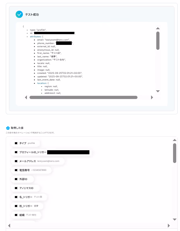 「テスト成功」の文字とリクエスト内容がJSON PATHで表記され、共に「取得した値」として、Klaviyoに作成したプロフィールの内容が反映されていれば成功です!