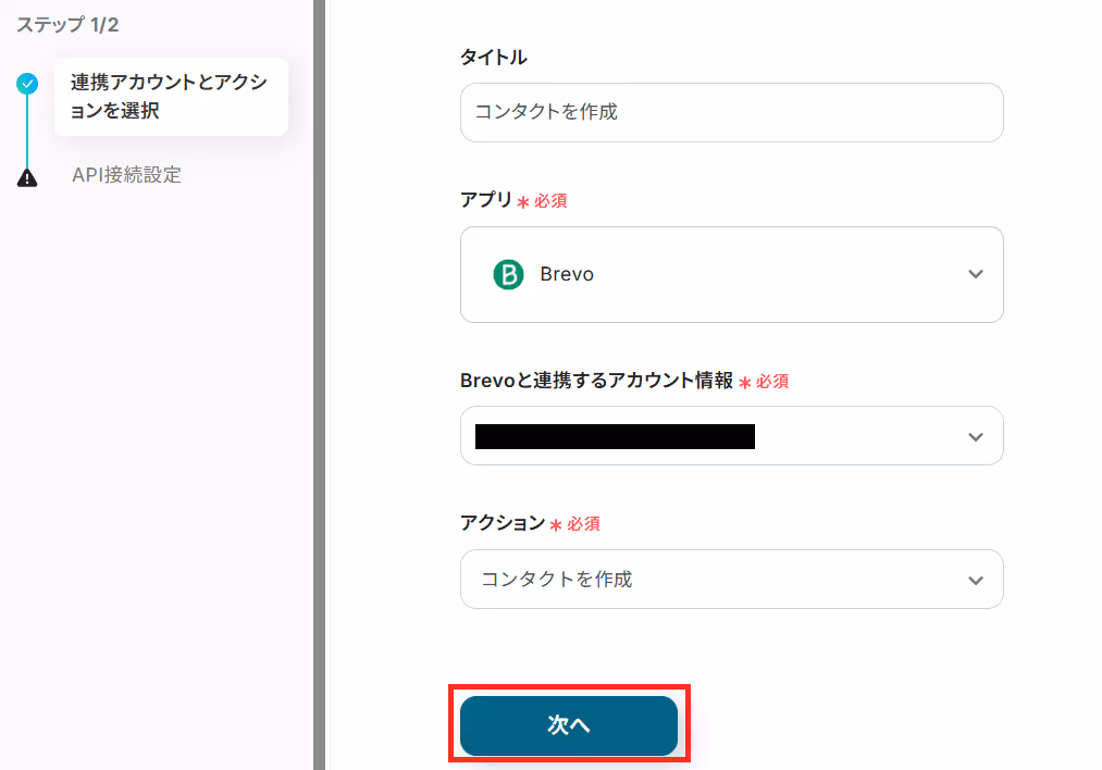 タイトルを任意で設定し、Brevoと連携するアカウントやアクション内容を確認したら「次へ」を押してください。