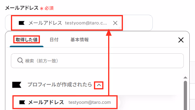 まずは「メールアドレス」に、アプリトリガーで取得した値からKlaviyoに登録されたメールアドレスの情報を設定してください。